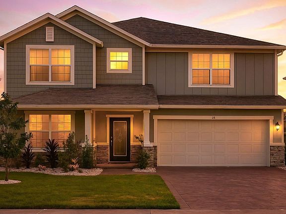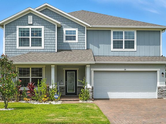 Discover modern lakefront living at 28 Ridge Road, located in the beautiful community of Sawmill Creek at Palm Coast Park. Built in 2022, this exceptional two-story Carlisle C model by Maronda Homes was thoughtfully designed with open living spaces, high-end finishes, and a layout that adapts easily to any lifestyle. Featuring five spacious bedrooms and three and a half baths, this home offers flexibility for families, guests, or multi-generational living. A private first-floor suite with a full bathroom provides the perfect setup for visitors or extended family. The open floor plan showcases upgraded windows that bring in abundant natural light and provide tranquil views of the lake. The kitchen serves as the heart of the home, featuring an oversized quartz island, upgraded stainless steel appliance package, soft-close cabinetry, pendant lighting, and a custom tile backsplash. Nearby, a flex room with French doors creates an ideal space for a home office, den, or creative studio. Upstairs, the primary suite delivers a true retreat with a tray ceiling, a massive walk-in closet, and a luxurious bathroom offering quartz countertops, upgraded cabinetry, and a spa-inspired shower with rainfall and side spray features. The additional bedrooms are roomy and comfortable, while the upstairs loft adds a secondary living area perfect for relaxing or entertaining. The laundry room, complete with upper cabinetry, is conveniently located near the bedrooms for easy access. Attention to detail is evident throughout, with crown molding, luxury vinyl plank flooring, plush carpet in bedrooms, cordless blinds, and a full LED lighting package. The home is equipped with a Strada smart home security system including motion sensors, SkyBell video doorbell, and a pre-wired network panel for seamless connectivity. The exterior design complements the interior quality, offering a 10x22 bronze-screened porch, covered front entry, stone-accent façade, and sealed paver driveway and walkway. The professionally landscaped yard features beach rock details, stone curbing, gutters, and upgraded garden beds. Additional conveniences include a whole-home water softener system (Leaf Home Solutions) and a garage utility sink. Every builder upgrade was selected with care, and post-closing enhancements were added to elevate both style and functionality. The result is a home that delivers the perfect blend of luxury, efficiency, and turn-key living. Sawmill Creek at Palm Coast Park offers a community pool and a serene lifestyle just short drive to nearby beaches and historic St. Augustine, with quick access to I-95, shopping, dining, and local recreation. Experience lakeside living at its finest—modern design, flexible spaces, and exceptional craftsmanship—ready for you to move in and enjoy.