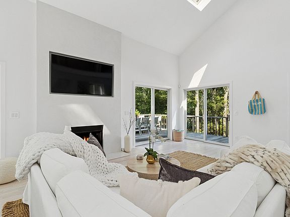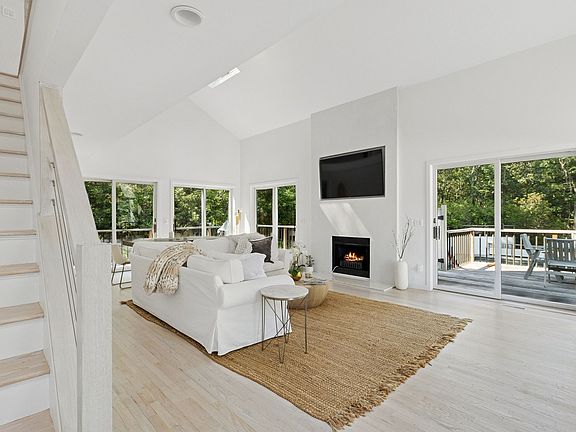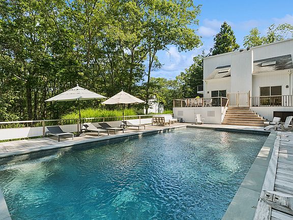 Tucked away on a private and serene 0.94 +/- acre setting, this renovated contemporary residence offers a seamless blend of style, comfort, and indoor-outdoor living in a prime Wainscott location. Spanning approximately 1,800 square feet plus a detached garage of 650 square feet, the two-story home features 3 spacious bedrooms and 2 full bathrooms, thoughtfully updated in 2020. The sun-filled great room is the heart of the home, boasting a vaulted ceiling with skylights, a wood-burning fireplace, and an open dining area-all surrounded by glass sliders that open to a generous wraparound deck. Perfect for entertaining or relaxing, the deck includes dedicated lounge and dining spaces that overlook the heated gunite swimming pool and beautiful grounds with natural beach grasses and mature plantings. The modern kitchen is fitted with professional-grade stainless steel appliances and elegant marble countertops, ideal for both everyday living and hosting. Total expansion potential for first, second, and lower levels is 3,900 sf and plans by architect Brian Glasser RA are included. Conveniently located with easy access to both East Hampton and Sag Harbor Villages, as well as the famed Atlantic Ocean beaches, this turnkey home offers a stylish escape in one of the Hamptons' most desirable areas. A rare combination of privacy, design, and location