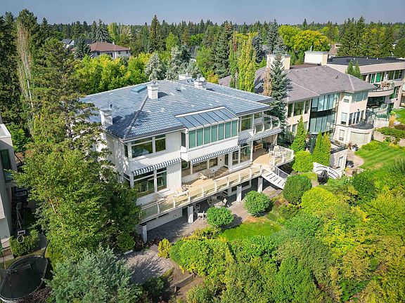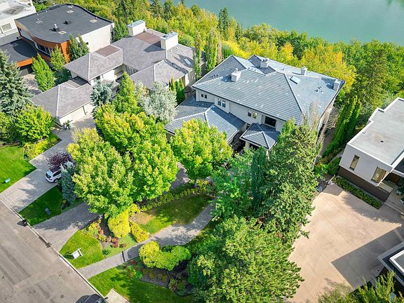 This iconic Crestwood home boasts a stunning panoramic view of our river valley and downtown. Architecturally designed, built in 2001 with an extensive million dollar remodeling completed in 2011 for a contemporary masterpiece. Featuring 5 bdrms, 7 baths,2 fireplaces, 10 ft ceilings, theatre room, in floor heating, nanny suite & walk out basement. The location is incredible, perched right on the river valley in a quiet, prestigious crescent. Beautifully landscaped by architect Doug Carlyle includes a waterfall feature greeting visitors. Flooded with natural light, the home feels welcoming, not pretentious. Every room is perfectly sized and enjoys lovely sight lines to take advantage of the view and the privacy. Entertaining sized dining room and dream kitchen by Heart Kitchens. Unbelievable dressing room off the primary bedroom must be seen! Excellent schools, great restaurants, coffee shops, grocery all within an easy walk. Lot is approx. 75" X 193". Truly one of Edmonton's finest residences.