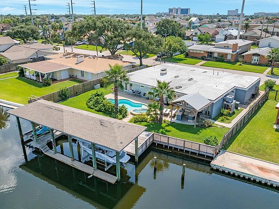 Waterfront with resort style amenities to include large boathouse with fishing lights, boat lift, double jet ski lift, resort heated pool with hot tub, outdoor kitchen with grill, double refrigerator, bar seating, and living space with outdoor seating. Great fishing, crabbing, paddle boarding, kayaking and boating right off the back dock. Inviting front entrance with seating area for enjoying gulf breezes. Entrance to home has wall to wall windows for waterfront views of the water. Expansive living with fireplace and dining flowing to the spacious family room. Kitchen is another gathering space that contains double oven, tons of cabinets, granite counters and storage with waterfront views. Primary bedroom suite has entrance to back living space, jetted tub with walk in shower with decorative tile and large walk in closet. 3 additional bedrooms located on the East wing of home with updated bath. Over sized 2 car garage space w/room for storage. Easy access to I-45 & minutes to beach.