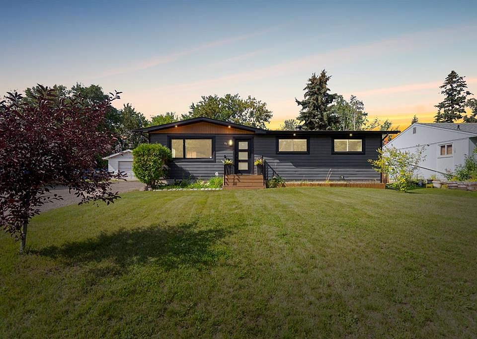 Welcome to 28 Alberta Drive: a fully renovated downtown bungalow that blends modern style with rustic charm. Beyond its bold black exterior, the home has seen extensive upgrades including a new high-efficiency furnace, central A/C, hot water on demand, upgraded electrical and spray-foam insulation all completed since 2018, and new shingles in 2017 making this home truly turn key while the modern aesthetic has it standing out from the rest. Inside, an open-concept layout showcases wide-plank luxury vinyl floors, a shiplap feature wall with an electric fireplace and a custom built-in bookshelf next to it. The kitchen is bright and functional with white cabinetry, stainless steel appliances, tiled backsplash and striking black accents. A pine ceiling with crown moulding adds warmth to the kitchen and dining space, while LED lighting and updated trim run throughout. Formerly three bedrooms, the main floor was reconfigured into a spacious primary retreat featuring a wallpaper accent wall, two closets plus a built-in armoire. The main bath has been fully updated with cabinetry and counters that match the kitchen, a tiled tub surround, and modern lighting above the mirror. A second bedroom completes the main floor. The open wood staircase leads to a beautifully finished basement with a rustic-modern feel. A striking three-piece bathroom features wood-look ceramic walls, a walk-in shower with body sprays, and bold black fixtures including an overcounted black sink and black toilet to match. The lower level also offers two additional bedrooms (one currently used as a gym), a family room with pine ceilings, and a stylish laundry space with herringbone tile behind the laundry sink. The backyard is a true escape with a new back deck the leads out to the landscaped fully fenced yard with an assortment of new trees and shrubs, a wood shed, small green house and the new garage. With major renovations completed between 2018–2025, this home is as functional as it is aesthetically pleasing. Offering the perfect mix of comfort and character, 28 Alberta Drive is truly one of a kind. Schedule your private tour today.