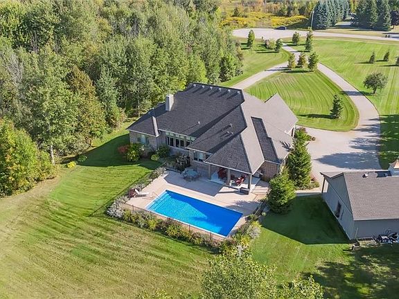 Welcome to an extraordinary custom-built residence by renowned builder Slotegraaf, set on one of the largest residential lots within city limits! This remarkable 3+1-bedroom, 4-bathroom home is ideally situated on a rare 9.3-acre private estate in the coveted Rolling Hills Estates neighbourhood. The timeless stone and brick exterior sets the stage for the craftsmanship inside, where wide plank hardwood flooring, deep baseboards, and crown moulding add elegance throughout. The grand living room features a coffered ceiling and a gas fireplace framed by a stunning marble surround. The gourmet eat-in kitchen is a chef's dream with full-height soft-close cabinetry, quartz countertops, a natural stone backsplash, and premium KitchenAid appliances, including a 6-burner gas range and double wall ovens. A large island with bar seating, walk-in pantry, and bright breakfast area with outdoor access complete this inviting space. Host memorable gatherings in the formal dining room, highlighted by a tray ceiling and striking chandelier. A quiet main-floor den offers an ideal workspace or retreat. The split-bedroom layout ensures privacy, with the luxurious primary suite on one side of the home and secondary bedrooms thoughtfully positioned on the opposite side. The spa-like primary ensuite boasts a double vanity, soaker tub, and oversized walk-in shower with a rain shower head. The fully finished lower level expands your living space with a fourth bedroom and bathroom, a large recreation room, and an impressive home theatre with bar area, Epson projector, projection screen, and built-in speakers. Step outside to an entertainer's paradise featuring a covered outdoor living room, in-ground pool, hot tub, and professionally landscaped grounds. A detached garage complements the attached two-car garage - perfect for hobbyists or added storage. From lot to location to luxurious living space, this property leaves nothing to be desired.