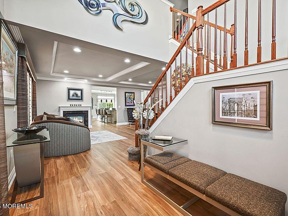 Welcome to the breathtaking Captiva Loft Royale, a rare and highly sought after residence located in the prestigious Four Seasons at Manalapan, where elegance and lifestyle come together in perfect harmony. This exquisite home has been thoughtfully upgraded to perfection, beginning with a dramatic two story foyer that immediately sets the tone for sophistication, showcasing 8'' wide porcelain hardwood look flooring that flows seamlessly throughout the main living areas. The living room is a true showpiece, enhanced by a coffered ceiling, intricate triple crown moldings, and a striking two sided gas fireplace that creates both warmth and grandeur. The gourmet center island kitchen is designed for the discerning chef, featuring 42'' custom white wood cabinetry, stainless steel appliances, st stylish gas tile backsplash, and a soaring two story vaulted ceiling that opens to the adjacent family room, making this the ideal space for gatherings and entertaining. The expanded primary suite offers a tranquil retreat with a beautiful bay window, coffered ceiling, dual walk in closets, and a spa-like master bath boasting an oversized Roman Shower with temperature gauge body sprays, exquisitely tiled walls, double sink vanities, and a smart bidet for ultimate comfort. French doors reveal a home office with 11 foot ceilings, while the first level also includes a guest bedroom adjacent to a designer full bath. Upstairs, the loft level is equally impressive, featuring a home theatre with a 100 inch screen and surround sound speakers, along with two additional bedrooms and a full bath. Outdoor living is elevated with a custom Timber Tech deck complete with a natural gas grill, complemented by a travertine paver walkway and professionally landscaped grounds that create a serene environment. Energy efficiency and convenience abound with solar panels, a whole house natural gas generator, and 2 zone HVAC. The Four Seasons lifestyle offers unmatched amenities including a 29,000 sq ft clubhouse, state of the art fitness center, game rooms, indoor and outdoor pools, pickleball, tennis, bocci, and endless opportunities for recreation and social enjoyment.
