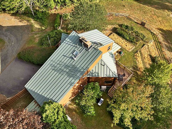 Sweeping viewsPassive-solar contemporaryGreenhouse spaceStanding seam metal roofVersatile home officeFlexible attached spaceCentral air conditioning