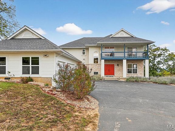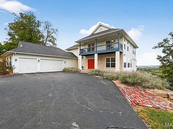 Nestled in a premier locale with sweeping vistas, this uniquely designed two-story residence offers an exceptional blend of space, style, and sophistication. The minimalist architectural element provides a dramatic first impression. Step into the foyer warmed by natural light with a sweeping staircase. A home office/library opens to the foyer and has a view of the front yard. The open concept living space is designed for effortless entertaining connecting the living room, chef’s kitchen/dining area and sunroom, each bathe in daylight, each having a fireplace and the breath-taking scenic view. A massive island anchors the kitchen, ideal for gatherings. Premium appliances, granite counters, and discreet walk-in pantry elevate both form and function. Enjoy your morning coffee on the deck where the sunrises are sure to mesmerize. Upstairs a spacious primary retreat with large walk-in closet, spa-style bath w/ separate soaking tub, shower, dual vanities and that fabulous view! Three additional bedrooms each with easy access to their own full bath and walk-in closet, ideal for family, guests, or flexible use like a home office or creative studio. The lower level is finished with painted concrete floors for function/style and plenty of windows. This level is a wonderful space for a recreation area, game room, or theater room. A separate bed/bath and workout room complete the walk out lower level. Stunning panoramic views all the way to the St Louis Arch on the horizon!
