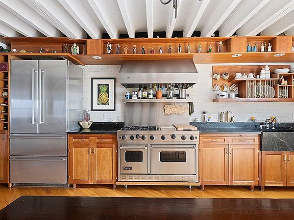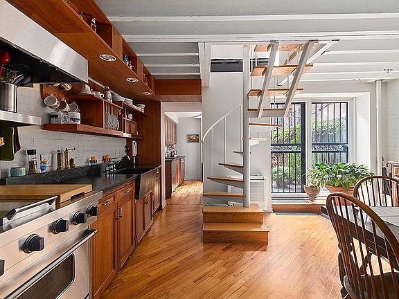 The main entrance to the townhouse is under the stoop where a charming forecourt provides a transitional space from the city’s hustle and bustle into the heart of the home. The garden floor is an open-concept great room with dedicated areas for both formal sitting and casual dining amid a delightful chef’s kitchen. Exciting design features such as exposed floor joists, painted brick, and rich wood cabinetry harmoniously blend modern and original elements. The kitchen has multiple workspaces and includes a Viking range with a double oven, two sinks, dishwasher, and a large stainless-steel refrigerator. After the dinner dishes are done, you can step right outside to enjoy the garden, which is a true haven with mature potted trees and lovely ivy adorning the privacy fences. A closet and bathroom with a shower complete the floor.