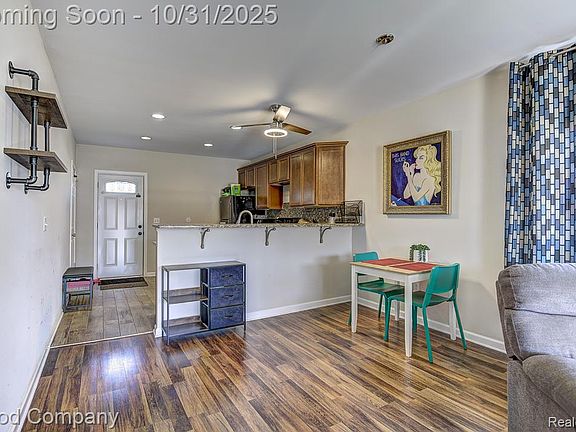 Beautifully remodeled Hazel Park ranch with a spacious open floor plan, high ceilings, and a large backyard. A charming covered front porch welcomes you into a bright and airy living room that flows seamlessly into the open dining area and kitchen. The kitchen features ceramic tile flooring, rich cabinetry, granite countertops, bar seating, and a stunning mosaic backsplash. Two generously sized bedrooms offer great closet space and share a stylish full bath with updated tilework and fixtures. Outside, enjoy a big fenced yard with a raised wood deck, concrete driveway, and a detached two-car garage. Convenient location with easy access to downtown Ferndale, Royal Oak, and Detroit via nearby freeways. Welcome Home!