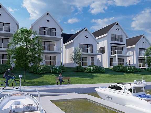 The "Pilot House" Boat-House offers 1700 square feet in size with two bedrooms, 2 1/2 baths, charming front porch and two back decks, open concept island kitchens, and living rooms, owner's suite with private bath, and an optional finished walkout lower level of 850 sq/f with recreation room, full bathroom, bedroom, and storage. The Boat-House homes feature generous porches, outdoor community spaces, and harbor views. The lower level walk-out faces the harbor walk, providing homeowners with immediate access to the water amenities. The monochrome streetscape ties these homes together as a micro-hood on the West Peninsula. The Boat-House homes showcase the architectural style of modern farmhouse with a nautical flair. Additional upgrades and options available with cost.