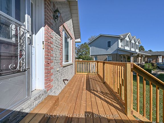 Quiet crescentBig picture windowNew entry deckWood cabinetsDouble sinkMain floor laundryTile flooring
