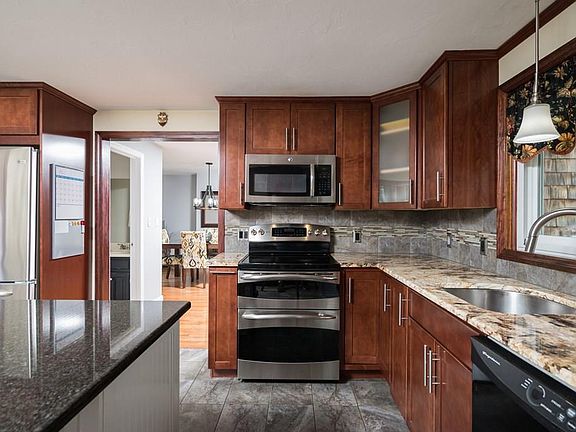 This freshly painted home is an attached cape that features three bedrooms, two large living rooms, a remodeled modern kitchen that has been updated with modern appliances including a separate wine refridgerator. The extra wide doorways, over sized deck, fire pit and salt water pool allow for plenty of space for any event or family party. The property features renovated kitchen, baths, hardwood floors, converted garage that expands the living space. There is a large deck to private yard, expanded driveway for ample parking and a balcony off of the master bedroom. New roof in 2011, Beautiful landscaping, most windows have been replaced. On a quiet dead end street. Granite counters, maple custom cabinets, plenty of storage in basement. Pellet stove. Central Air. Great, friendly street. Hard wired for generator with extensive outside eclectric and retractable sun awnings are perfect for summer parties.