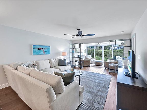 C10597. Beautifully updated. 3rd Bedroom has been converted to a den with a sleeper sofa. Closet doors were removed as well as the doors into the bedroom/den. Turnkey furnished with a fresh, light touch. There is a stack unit washer/dryer in the primary walk-in closet. Glassed in Florida room gives you more living space with lovely verdant garden views. Nice and private. Impact windows and sliders. Updated AC, water heater and appliances. Two blocks to the Gulf of Mexico and two blocks to Fifth Avenue South for fine dining and shopping. No rentals are allowed in the first two years of ownership. Assigned parking space is next to the residence.