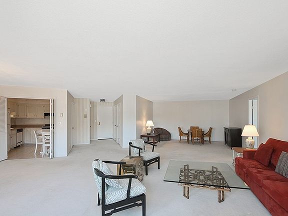 Oversized one bedroom with very open floorpan. At one time the living room area was opened up and was maybe a second bedroom. flexible space! Master has 3 closetsincluding a large walk in.Laundry on every floor just down the hall.Unit faces SW facing the front of the building and the mall. Building has may amenities including an Exercise room, Club room, Library, pool ,Sauna, and concierge service 24/7.Easy access to dining and shopping and transportation.Not updated recently but great space and shows well.