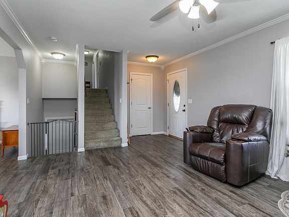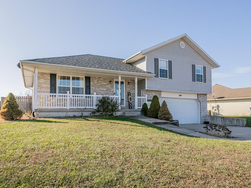 Enjoy the outdoors with a community lake and a great neighborhood. This house offers a well maintained lawn with a covered front porch perfect for relaxing. Inside there is vinyl flooring throughout with an open living, kitchen and dining room space. Easy access to your private back patio and fenced in yard. There is extra storage and a large 2 car garage.