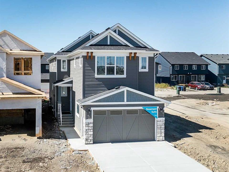 The Purcell 24 built by Brookfield Residential offers nearly 2,900 square feet of living space over its three levels and includes a legal basement suite with private entrance! This property is perfect for a large growing family, investor, or those who want plenty of space to host while reducing their monthly costs by renting their legal basement suite. Featuring 3 living areas, a home office, 4 bedrooms (3 up, 1 down), 3.5 bathrooms (2.5 up, 1 down), this home is perfect for families of virtually any size! The main level of the home features a large den / flex space that is perfect for a home office. The large kitchen is complete with timeless two tone cabinetry and features warm mid-tone resilient vinyl plank flooring throughout the main level. The walk-through pantry from the garage / mudroom provides added convenience for everyday living with double closets in the mudroom providing plenty of storage. The kitchen opens to both the living and dining areas - making this the perfect space to entertain guests and the sliding barn door keeps the office space private when needed. On the second level, you'll find a central bonus room that separates the primary suite from the secondary bedrooms. The primary suite is complete with a walk-in closet and full 5 pc ensuite with soaker tub, dual sinks, a walk-in shower and private water closet with door. Two more bedrooms, a full bathroom and a large laundry room complete the second level. The professionally developed basement features a 1 bedroom legal suite that is perfect for a rental suite or hosting family. The suite includes its own kitchen, living/dining area, full bathroom and laundry - all with its own private side entrance. This property is brand new, nearly move-in ready (complete in May) and features plenty of upgrades throughout. Builder warranty and Alberta New Home Warranty are included with purchase so you can buy with peace of mind. Purchase now and celebrate this spring in your brand new home! **Please note: photos are from a show home model and are not an exact representation of the property for sale.