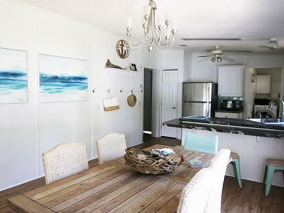 As you step inside, you'll be greeted by an open-concept living, dining, and kitchen space with large windows that frame tranquil lake views and flood the home with natural light. The updated kitchen features stainless steel appliances, plenty of cabinetry and counter space perfect for preparing meals after a day at the beach.