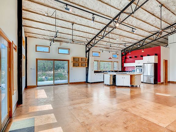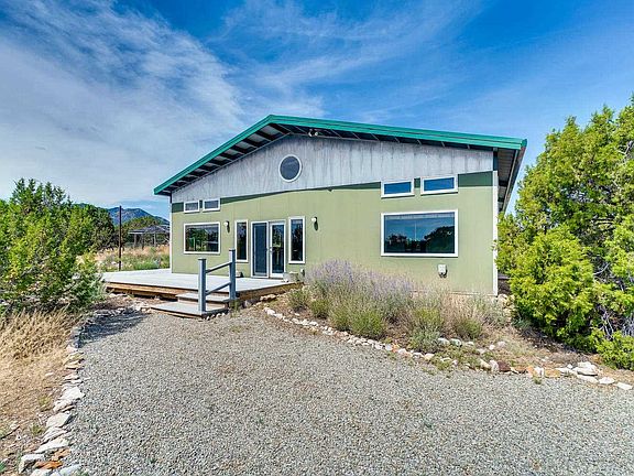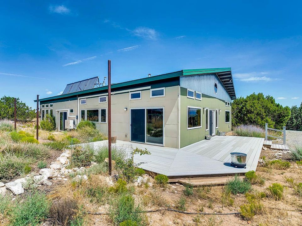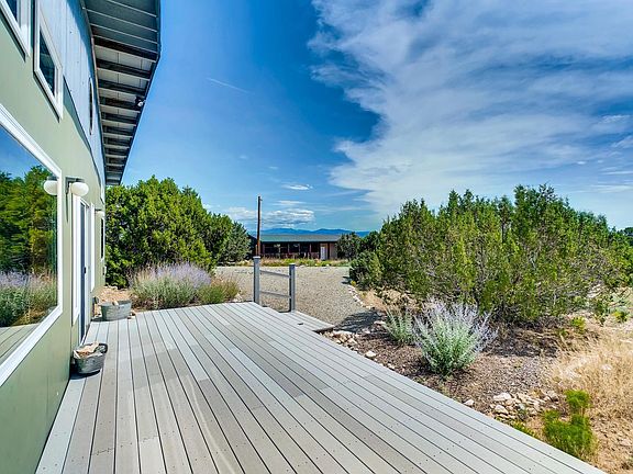 GREAT NEW PRICE: This contemporary, low-maintenance and highly-efficient home is well-sited on over 18 acres directly off a paved County road. It's a TURN-KEY HORSE PROPERTY with modern barn with three 12x12 stalls, tack room, hay storage and three turn-outs. Additional outbuildings are available. A training arena is included. Enjoy exquisite views from the wrap around porch high on the mesa, as well as from this modern home with open floor plan, 16-foot ceilings and lots of natural light. This home with contemporary feel includes refrigerated air along with in-floor radiant heat warmed by the sun through solar heating panels, with propane back-up. Passive solar design. Stainless steel appliances enhance the chef's kitchen with island in the great room with Russian-birch floors throughout. Third bedroom suite with office area and separate entrance could also make great studio or apartment area. The new steel-framed barn structure is an easy conversion for other purposes such as studio or casita. Located off the Scenic Turquoise Trail with open mountain views and pleasing rolling terrain dotted with cedar and juniper trees. Gated entrance just off pavement on County road. Barn dimensions are 20' x 62' x 10'.