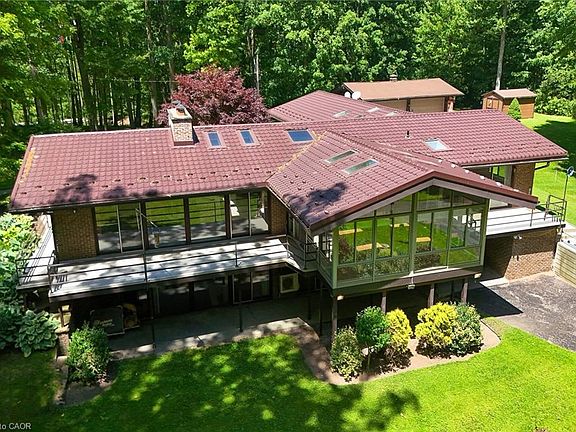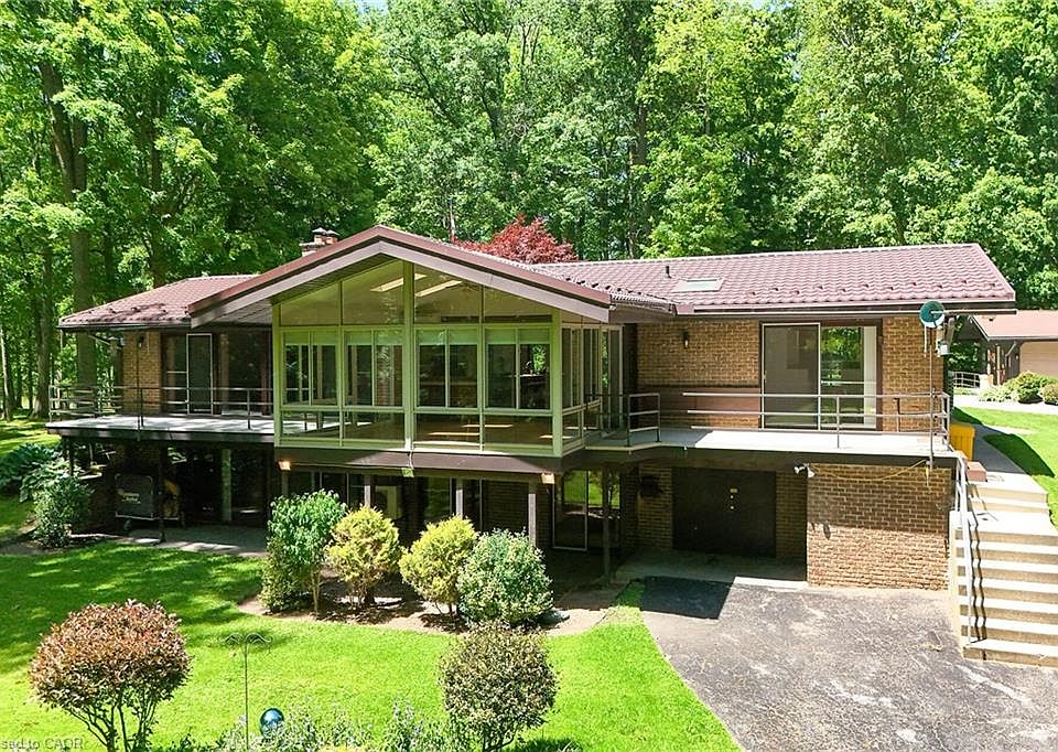 This is a legacy property—an inspiring blend of architecture and nature, ideal for those seeking privacy, space, and potential. A breathtaking 10-acre private estate of rolling green hills manicured exquisitely, mature trees, a private pond and thoughtful placed mid-century modern build seamlessly blends together the tranquility of nature with timeless architecture. Surrounded by wildlife and manicured grounds, this property offers a private, park-like setting waiting for your vision. A winding paved driveway features access to the main home and detached garage with ample parking and as well as access to the rear walkout level and additional parking. This bungalow is designed to make full use of the property, featuring skylights for natural warm ambient lighting, full wall length windows and glass sliding doors that all lead to the wrap around porch and connect at a climate-controlled sunroom that you will make your favourite space. Inside you will find a spacious primary suite with two private 3- pc ensuites, a second bedroom with its own 3-pc bath, a laundry/mudroom with garage access, an eat-in kitchen with pocket doors into the dining/living area, and a two-level peninsula-style fireplace serving as the centerpieces for both main and lower levels. An additional 2-pc powder room is conveniently located off the dining room for guests. The lower level walkout includes 2 large bedrooms with glass sliding doors, a 5-pc bathroom, a spacious rec room with wet bar, and an oversized mechanical room with exterior access and large storage space. The attached 2-car garage has a gas heater along with access to the laundry room and outside of the home. The detached 4-car garage matches the home’s architectural style and includes heat and power. Rarely does an opportunity arise for a spectacular, truly one-of-a-kind property such as this; a true "Touch of Heaven". Be sure to check out the videos and virtual walking tour, or schedule your own private viewing today!