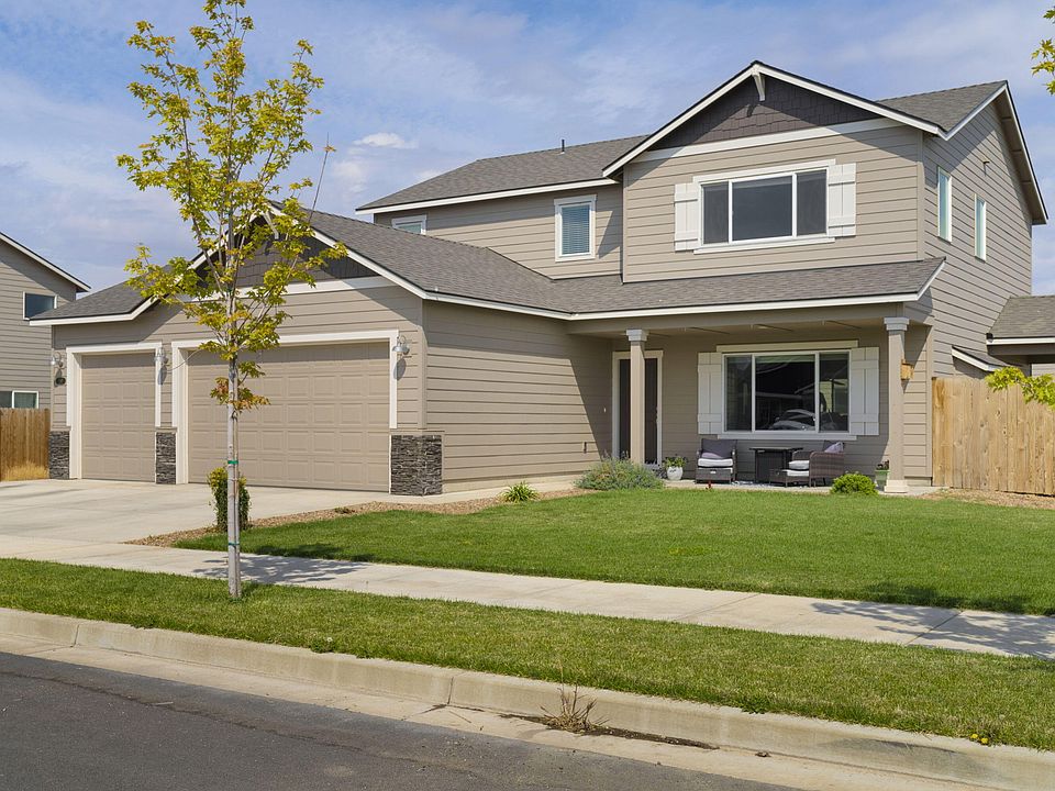 Welcome to your dream home! Nestled in a charming neighborhood, this sprawling 2386 sq ft residence blends luxury and comfort with its 4 spacious bedrooms and 2.5 elegant baths. The primary suite on the main floor is a retreat, featuring a sumptuous soaking tub and an expansive walk-in closet. Upstairs, discover three generously sized bedrooms and an extra-large loft, perfect for a TV room, game room, or office. The state-of-the-art kitchen will impress any chef with its stainless 5-burner gas range with air fryer and convection oven, quartz countertops, large island, and pantry. All energy star appliances, including a refrigerator and dishwasher, make this kitchen both stylish and efficient. Enjoy comfort year-round with a forced air gas high-efficiency furnace and a cozy gas fireplace, plus the convenience of a spacious 3-car garage. Step outside to a landscaped yard, complete with a fully fenced backyard and a lovely covered patio perfect for outdoor entertaining.