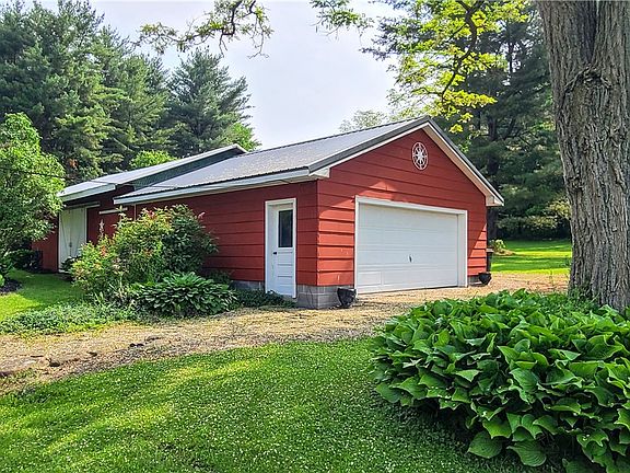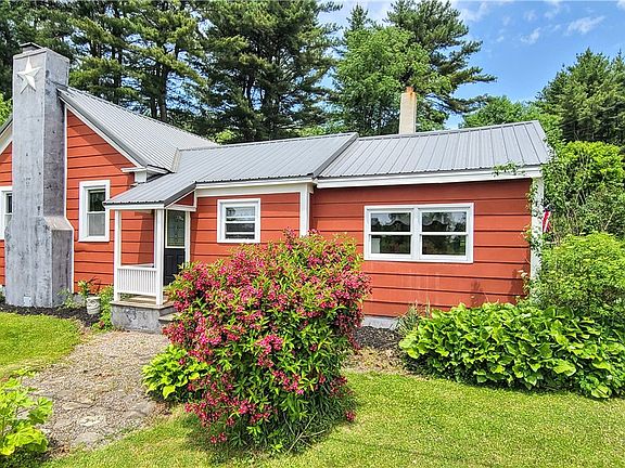 Nestled in the rolling hills and scenic meadows just outside of Ithaca, this charming early 19th-century home—once District School #2—has been thoughtfully transformed from a one-room schoolhouse into a spacious and inviting residence. Taken down to the studs and rebuilt within the past 20 years, it blends original charm with modern comfort, featuring high ceilings, a classic brick wood-burning fireplace, and the original school bell. The large country kitchen offers abundant white cabinetry, expansive dark granite counters, and a generous eat-in dining area perfect for gatherings. A bright and open living room with a wall of windows centers around the fireplace, while a separate family room with a coal stove and more windows captures afternoon light and breezes. Down the hall are two well-sized bedrooms, including a two-room primary suite with a private deck, hot tub, and sweeping views of the beautifully maintained 9+ acre property. The flexible layout allows for an easy conversion to a third bedroom or office. Enjoy landscaped gardens, expansive lawn space, deep woods ideal for hiking or camping, and a serene spring fed pond visible from the rear deck—stocked with fish and frequented by a variety of wildlife. Be sure to admire the lovely country views that stretch for miles over the neighboring fields. A two-car garage plus a large attached free-span outbuilding with overhead and sliding doors provide excellent space for a workshop, storage, or animals. Set on a peaceful country road yet just 15 minutes to Cornell, Ithaca, and amenities, this well-cared-for property includes high-speed internet and numerous updates throughout.