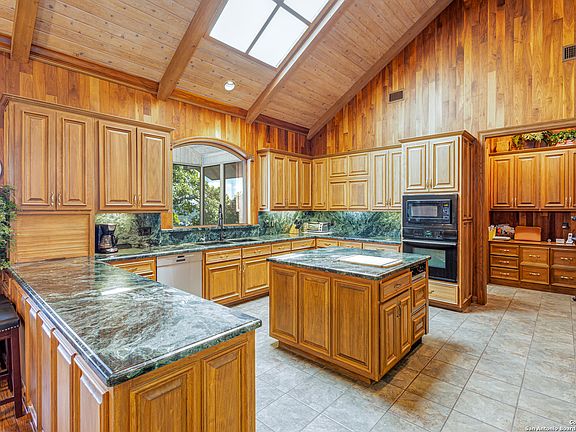 Texas Hill Country - Kerrville, TX -Perched majestically on a scenic overlook in Kerrville, this beautiful, private estate combines Hill Country charm with refined luxury in a single-level 4-bedroom, 5-bath home spanning 4,687 SF of thoughtfully designed living space. Located just outside the city limits, you will enjoy lower county real estate taxes and no HOA restrictions, while being only 5 minutes to the medical center and grocery shopping. The impressive exterior features natural limestone construction, an arched entryway, wooden double doors with leaded glass windows, and low maintenance landscaped grounds. Inside, vaulted ceilings, exposed beams create dramatic, light-filled spaces. The Great Room with fireplace showcases panoramic views perfect for night views of twinkling city lights below. The gourmet kitchen has rich cabinetry, marble countertops, and a center island. The master suite is a serene retreat featuring a private sitting area with a fireplace, a soaking tub, separate shower and walk-in sauna. In the east wing you have 3 ensuite bedrooms, private sitting room, galley kitchen which opens to a patio. Perfect for entertaining or a separate caregiver quarters.