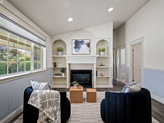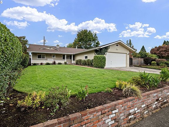 Beautifully updated home in the Ferry Street Bridge neighborhood offering 4 bedrooms (or 3 and bonus/flex/office space), 2.1 baths and 1,731 sq ft of living space. Covered front porch welcomes you into bright vaulted-ceiling interiors with abundant natural light. Main living area, family room, dining and kitchen feature luxury vinyl plank flooring; bedrooms are newly carpeted. The living room includes an updated gas fireplace and remote-operated blinds. The open kitchen boasts oak cabinetry, updated counters, backsplash, sink, island and gas range. French doors open to a covered deck with hot tub and expansive concrete patio beyond. Mature landscaped yard includes sprinkler system. The primary suite features a walk-in closet and gorgeous updated bath. A detached shed/workshop has its own electrical and ductless heat pump/AC. The two-car garage includes a 220-amp outlet. Don't miss out on this wonderful turn key home minutes to Oakway Center & Autzen Stadium.