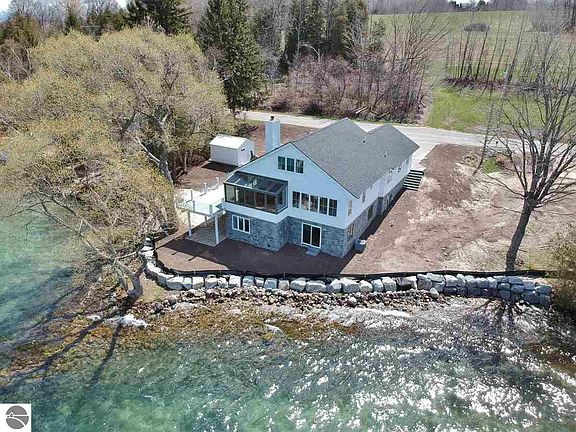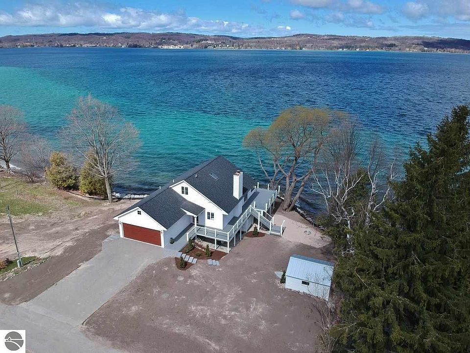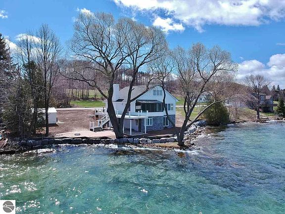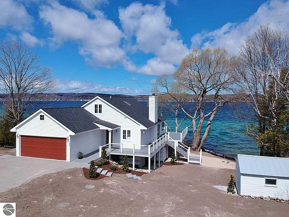 This fully remodeled classic coastal lakefront home is the ideal Northern Michigan retreat offering panoramic sunset water views and 103' of direct Suttons Bay water frontage located on desirable Stony Point Peninsula just minutes from downtown Suttons Bay! A rare opportunity to purchase a recently renovated ~3,260 sq. ft., 4 bedroom, 4.5 bath waterfront home featuring an abundance of modern upgrades including a spacious great room with stunning unobstructed Bay views throughout, hardwood flooring, a new gas fireplace, entirely new luxury kitchen with stainless steel appliances, quartz countertops and custom built-ins, newly renovated baths, 3 master bedroom suites, finished walkout lower level, all new flooring throughout, new mechanicals, new plumbing, new electrical, and so much more! The low maintenance exterior features a new composite deck with glass railings, new shingles, new well & septic, and perfect topography for boat dockage. This unique property is ideal for boating and swimming and the home sits on its own small peninsula which makes you feel as if you are nearly on top of the water!
