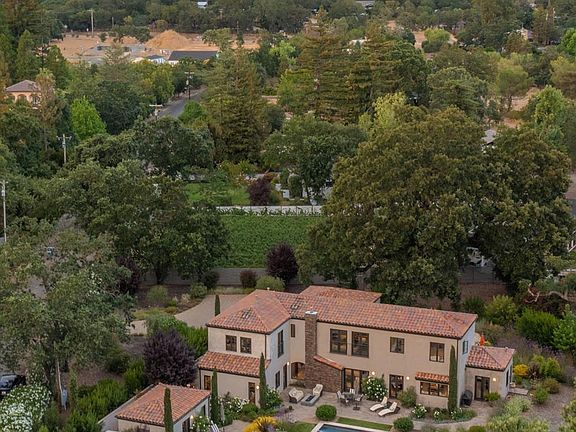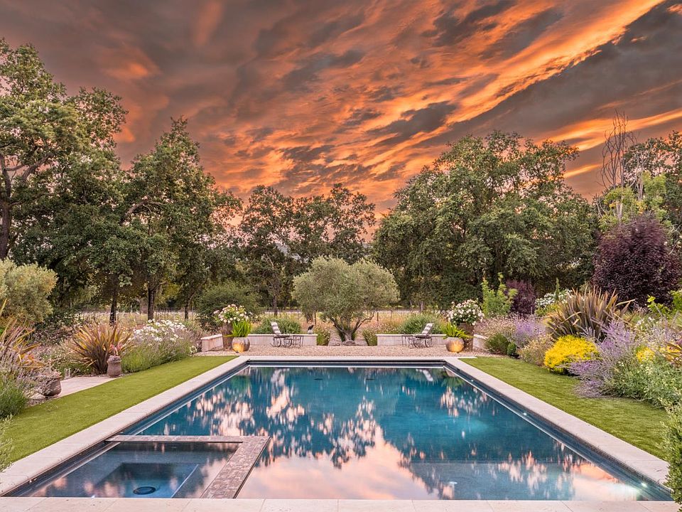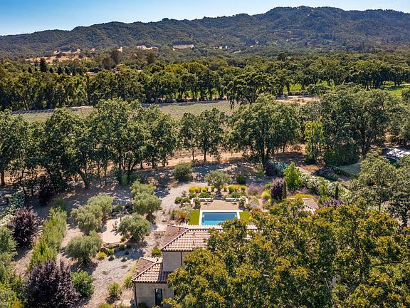 Completed in 2018, this Wine Country retreat blends timeless architecture with modern design on nearly an acre adjacent to the scenic Serres Vineyard. A resort-style pool and spa anchor the grounds, creating seamless indoor-outdoor living. Smooth Santa Barbara stucco, a mission barrel-tile roof, and metal-casement French doors balance classic charm with a modern aesthetic. The main level features polished concrete floors, a chef's kitchen with Thermador appliances and concealed hood, and French doors opening to the pool, spa, and ancient olive grove. Upstairs, wide-plank oak floors lead to a tranquil primary suite with dual French doors framing vineyard and pool views, plus a guest bedroom and bath. With three bedrooms in the main residence, a flexible office/guest room, and a detached pool house with an exterior-access bath, the property offers versatile living. Landscaped gardens with lavender, roses, and meandering pathways surround a gated entry courtyard with artisan urn fountains, all just moments from the Sonoma Golf Club and Fairmont Sonoma Mission Inn & Spa.
