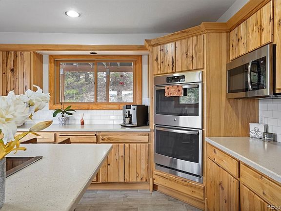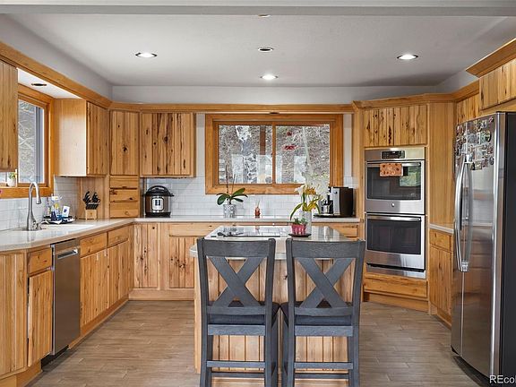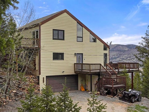 Welcome to the most breathtaking, unobstructed mountain view you'll find in Evergreen! Nestled amidst the pines on 4 private acres on Saddleback Mountain, this light-filled, modern 2-story home offers mountain living at its finest. Enjoy a convenient commute of only 35 minutes to Downtown, just minutes off of I-70, and 40 minutes away from Loveland Ski Area. As you step inside, you'll be captivated by the snow-capped peaks and awe-inspiring front-range views. The open-plan living area under vaulted ceilings and wall-to-wall windows floods the space with natural light. The kitchen boasts ample seating, perfect for cooking and hosting friends, with stainless steel appliances, solid surface counters, beautiful hickory cabinets, under-cabinet lighting, custom drawers, crown molding, recessed lights, and natural timber whitewash woodgrain plank floor tiles. The main and upper floor feature a radiant heat system to keep you cozy. The vaulted family room not only showcases endless mountain views but also a striking fireplace. Additionally, a spacious dining area, a bedroom, and a 4-piece bathroom grace the main floor. The primary suite, occupying most of the second floor, is the true showstopper, with a vaulted tongue-and-groove ceiling and a private deck, perfect for enjoying your morning coffee. The bathroom features a large steam shower and an Empava flat-bottomed tub—a must-see! The second floor also offers a loft, ideal for a home office. The lower level boasts a large family room with another wood-burning fireplace, garage access, a bathroom equipped with laundry, and access to the new deck and stone patio.
