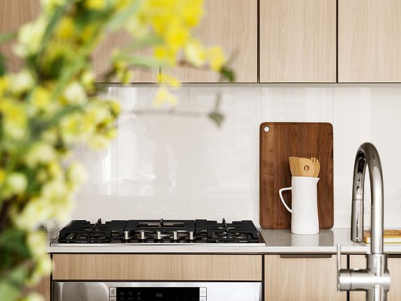 Thoughtful kitchens are adorned with Caesarstone countertops and backsplashes, white oak cabinets, and Bosch appliances. Spa-inspired bathrooms feature oversized Italian-inspired stone-style tiles and oak vanities with white Caesarstone sink tops.