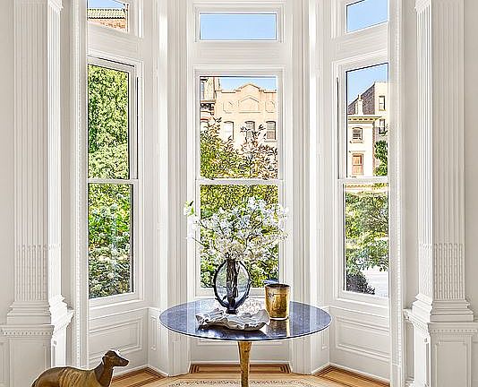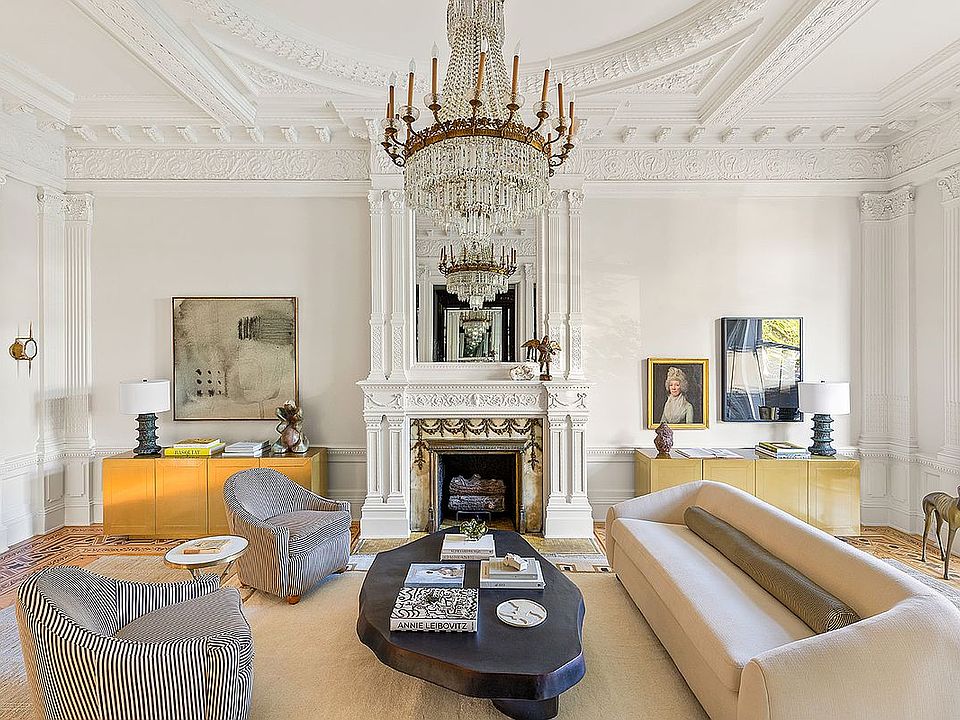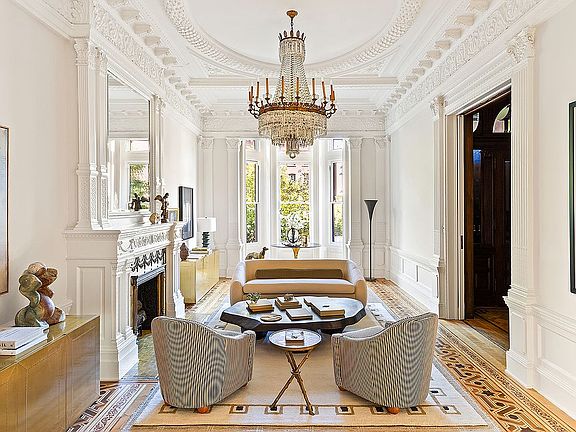 Spanning roughly 10,000 square feet over five stories, the layout offers seven bedrooms and six full bathrooms (plus additional half baths) across its elegant wings. The parlor level, stretching about 105 feet deep, hosts formal living and dining salons, a generous sitting room, and a chef’s kitchen enlivened by a rear extension of curved glass and custom copper roofing. The upper floors accommodate the principal suite, multiple en suite bedrooms, a library or study, and gracious secondary rooms.