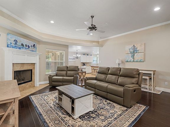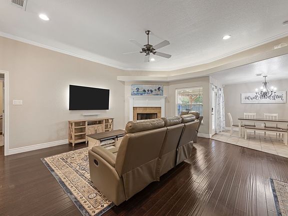 Corner oriented fireplacePlush backyardCovered back patioTray ceilingOpen concept livingDual vanities