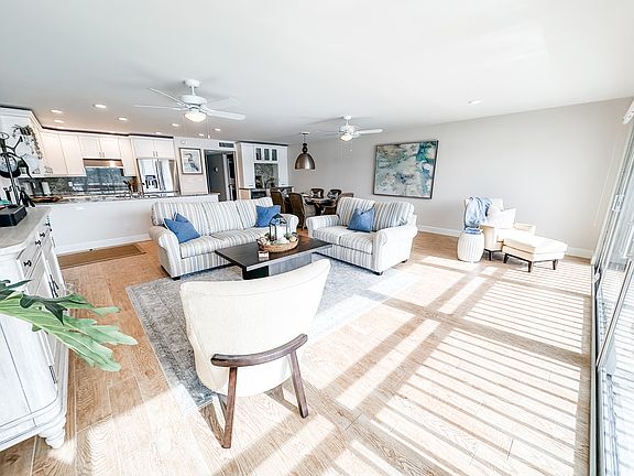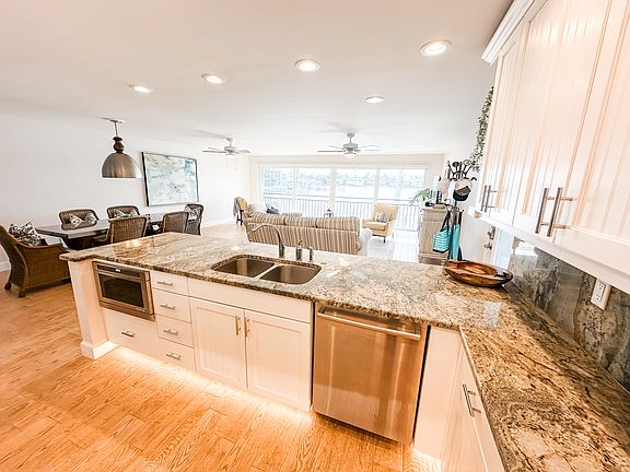 The recently renovated open floor plan provides the perfect space for entertaining or relaxing with the meticulously decorated and modern kitchen, dining and living room all connected with water views. Enjoy the bay view through sliding glass doors and a screened window spanning the entire width of the home, complemented by a beautiful dining room table