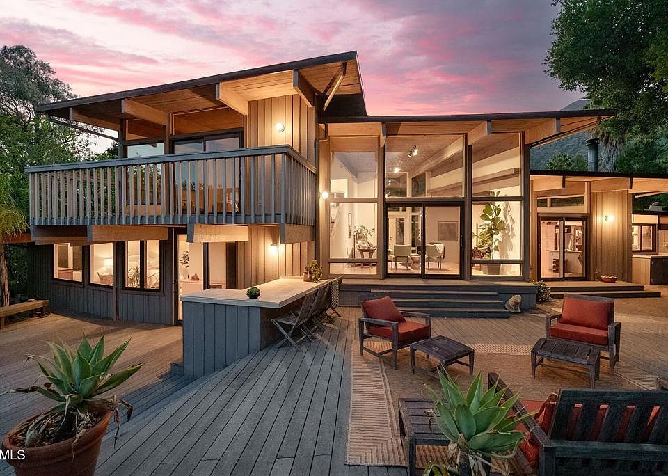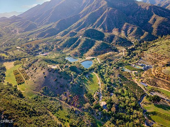 Welcome to your Secluded Sanctuary in the exclusive Hermitage Ranch, nestled on its own 45.12 acres of natural serenity, with two ponds, a running creek and a mountaintop. First time on the market in over 30 years, this property is part of a 450 acre working avocado and citrus ranch, where numerous paths beckon you to connect with nature and immerse yourself in peaceful ranch life. The centerpiece of the property is a striking radial home, architecturally designed in the 1980s by Donald Hoppen, a student of Frank Lloyd Wright, and updated over the years. The double-decker windows frame front and rear vistas, bringing the outside in, and allowing you to feel as if you are living in a contemporary tree house. The main residence offers three bedrooms, three full bathrooms, plus a loft, across approx. 2526 sq.ft. Crafted for both comfort and entertaining, the home features vaulted ceilings, towering beams, windows galore, bamboo floors, a ceramic wood burning stove, plus an expansive trex deck for luxuriating in magical sunrises, pink moment afternoons, and glorious moonlit nights. The chef's kitchen, with generous counter space, invites culinary exploration with a Wolf 6 burner range and 2 burner grill, double ovens, and Bosch dishwasher. The primary ensuite is its own lower level retreat, with an expansive bathroom, front patio and separate access to the back deck. Upstairs is a versatile loft, with a balcony and glorious views-ideal for an in-home office or TV room, and connects to a full bath and a second bedroom. The third bedroom and bath are near the side entry door, creating a unique multi-level layout. A separate one bedroom, one bathroom guest house of approx. 750 sq.ft. is secluded and private, perfect for visitors, extended family or rental opportunities, and adds valuable flexibility to this already extraordinary property. Plant more avocados, create a vineyard, the options are endless. The property's two reservoirs are available for fishing, swimming, kayaking or just relaxing by the docks. Or you can hike up to the labyrinth which features stunning views of the Ojai Valley. The property is under the Williamson Act which has potential for agricultural property tax advantages; the water supply is from the Hermitage Mutual Water Company, owned collectively by the property owners in the ranch. This piece of paradise which is hidden away from most of the world is only six minutes from Ojai and provides a magical place to get away from it all.