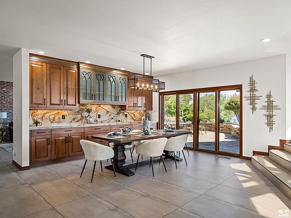 Stunning one-story home in Lake Ridge Shores, a private gated community with 24-hour security & lakefront access to Lake Stanley. This neighborhood has the feel of a private retreat, but is seven minutes away from shopping, schools, dining, & less than 15 minutes from the Reno/Tahoe Airport. A wide semi-circular driveway leads into a spacious four-car garage with custom floor-to-ceiling locking cabinets on all sides, including a large, well- lit workshop along the back wall. Oversized windows throughout, the home connect you closely to nature with inspiring lake and mountain views and numerous skylights bring in soft, natural light. Open, airy floor plan in the kitchen, dining room, and elevated living room are perfect for entertaining. A remodeled kitchen features two marble-top islands, one with a farmer's sink and sitting counter, stainless steel appliances, and a Monogram 6-burner stove with griddle and foldable pot filler. Under-cabinet lighting throughout the kitchen and dining room add to the welcoming mood. The primary retreat includes an office with a spacious bathroom, oversized dressing room lined with custom cabinets, and a large middle island with multiple lined drawers. Separate guest wing has three bedrooms, all en suite with custom closets and remodeled bathrooms. One of the bedrooms has been converted to an office/study that opens to a small separate garden. Each room has a sliding glass door that opens to an enclosed landscaped outdoor patio which wraps around the house. Enjoy outdoor living on the lakeside patio that widens off the family room with a built-in gas grill and space for a large table and chairs. The split cottage door leading into the family room is handy for passing food and drinks during outdoor barbeques. Other features include a gas fireplace, central A/C, central vac, and an alarm system with outdoor motion-detector lighting. There's a seller's home warranty on the property which can be transferred to the new buyer after close of escrow.