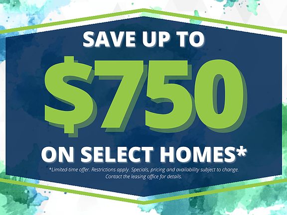 - Special offer! Save up to $750 on select homes! *Limited-time offer. Restrictions apply. Specials, pricing and availability subject to change. Contact the leasing office for details.
