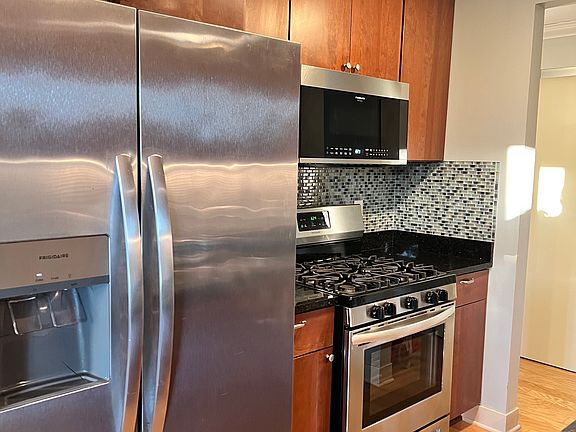 Beautiful galley kitchen with cherry cabinets and granite counters built in dining table ! Beverage refrigerator, hardwood floors thru out, plenty of storage! King sized bedroom.