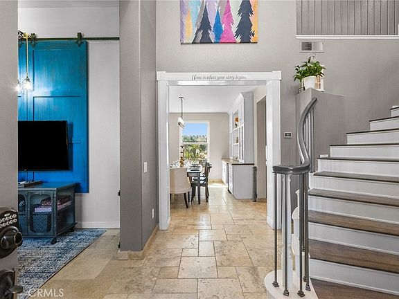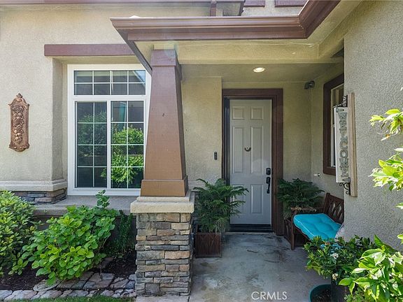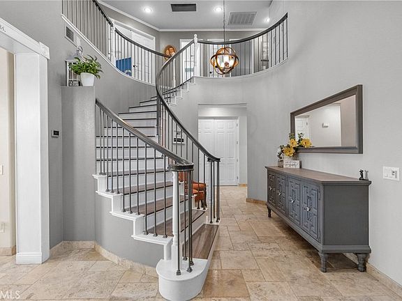 Fabulous views from this 5-bedroom, 3 full bathroom home. Nestled perfectly on a cul-de-sac set in the Canyon Crest community. This well-appointed home entry opens into a soaring 2-story foyer with a beautiful curved wooden staircase. You are greeted with a formal living space and formal dining room with lots of natural light. A beautiful bar and wine fridge is set nicely in the dining room. The remodeled kitchen is open to the family room and has stainless steel appliances, quartz countertops, a breakfast bar and an area for an eat-in kitchen. The Family room surrounded by natural light is large with a cozy fireplace and flows right out to the backyard. There is one bedroom downstairs and one full bathroom and the laundry room. The Primary suite is at the top of the stairs. Spend your mornings sipping coffee enjoying the views from your balcony. The suite has a fireplace, walk in closet, 2 sinks, separate tub and tiled shower. There are 3 more spacious bedrooms and a bathroom upstairs. The views in the backyard are fabulous. It is the perfect gathering place with a built in BBQ island, covered patio with a relaxing pool, spa and waterfall. The patio is adorned with a built-in sitting area and plenty of space to chill. This home sits back on the lot which provides one of the largest driveways and a 3-car garage. If that's not enough this home also has solar and No Mello Roos.