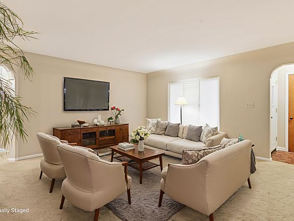 Extra wide driveCoved ceilingsCorian countertopUpdated kitchenHardwood floors under carpet
