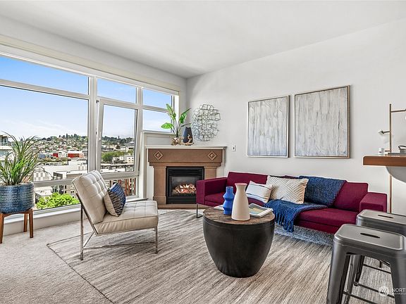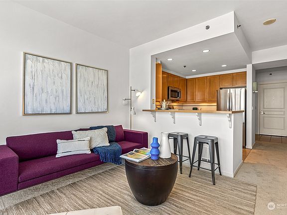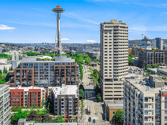 Step into this exceptional 1 bedrm+den w/spectacular NW views of Puget Sound, Olympic Mts, Sculpture Pk & Space Needle. 9-ft ceiling w/huge windows provide ample natural light, connecting one to cityscapes yet situated on 11th flr offers quiet escape. Den makes the perfect home office or dining. Roomy kitchen w/SS appliances, gas stove & FP, balcony, in-unit W/D. Spacious ensuite sweeping view primary bedrm has walk-in closet. Indulge in Ellington amenities:24/7 concierge, gym, hot tub, club rm w/full kitchen & dining, conf rm & outdr decks. Secured parking. No rental cap. Solid HOA, no spec.assessments. Explore renowned restaurants, shopping, art scene or stroll along waterfront/Pike Place Mkt. Easy access to transit/freeways.97 WalkScore.