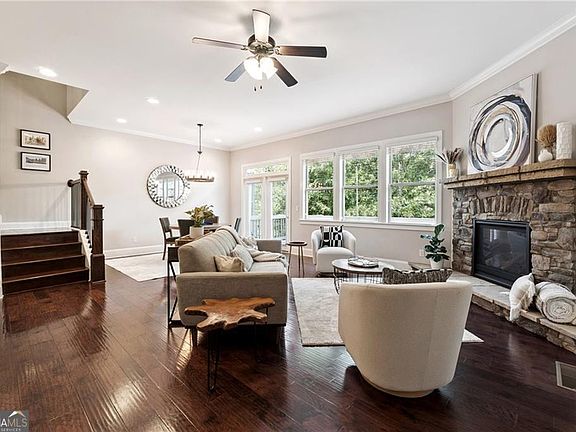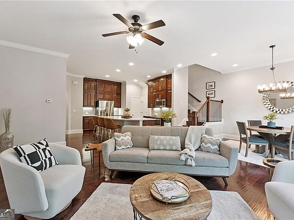 Welcome home to charm, comfort and convenience in sought-after gated community of Towns at Breton Ridge! Just a quarter mile from The Battery and Truist Park, this luxurious 4-bedroom, 3.5-bath townhouse offers quick access to I-75 and I-285, making it perfect for both work and play. Step inside this thoughtfully designed floor plan that has new carpet and fresh paint throughout. The gourmet kitchen features double-stacked cabinets with under-cabinet lighting, quartz countertops, stainless steel appliances (including a refrigerator), double ovens with warming drawer, motion-sensor faucet, and a pantry with ClosetMaid shelving. The lower level offers a spacious fourth bedroom, full bath, and versatile living space-ideal for an in-law suite, playroom, or media room. Enjoy the outdoor patio and deck with a wooded view. Underdecking installed in 2022. Upstairs, a flexible loft area provides the perfect spot for a home office or additional sitting room. The laundry room is conveniently located on the upper level with generous storage. All full bathrooms are finished with tile floors and granite countertops, adding to the home's upscale feel. Additional highlights include low Cobb County taxes, ample storage throughout, and a one-step entry from the garage for easy access. Move-in ready and waiting for you-don't miss the opportunity to make this stunning home your own!