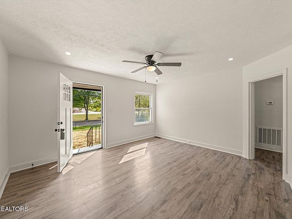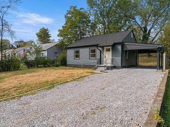 Step inside this newly renovated 2-bedroom, 1-bathroom home featuring a perfect blend of modern charm and timeless design. The inviting open-concept living room and kitchen boast abundant natural light from new vinyl windows, highlighting the bright interior that contrasts beautifully with the home's moody exterior. The kitchen is a showpiece with white shaker cabinetry, quartz countertops, gold accent hardware, a sleek ceramic tile backsplash, floating range vent, flat-top stove, and stainless-steel appliances. Elegant marbled LVP tile, black-accented doors and fixtures, and craftsman-style trim add a sophisticated touch throughout. Both bedrooms are generously sized and newly updated with fresh paint, lighting, and LVP flooring. The bathroom showcases a new vanity, toilet, and tub surrounded by modern finishes. Every detail has been refreshed—including gutters, siding, front door, outlets, switches, LED puck lights, ceiling fan, and more—making this home completely move-in ready. Enjoy outdoor living in the fenced backyard with a private patio, mature trees, and a two-car carport. Conveniently located just minutes from downtown Knoxville, I-640 and I-40, Whittle Springs Golf Course, local shopping, and dining. Directly across the street from Boright Park with walking paths, a playground, benches, and shaded green space—this home offers both comfort and convenience in an ideal setting.