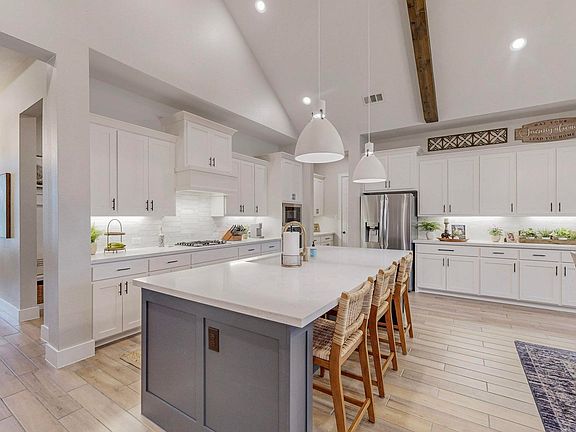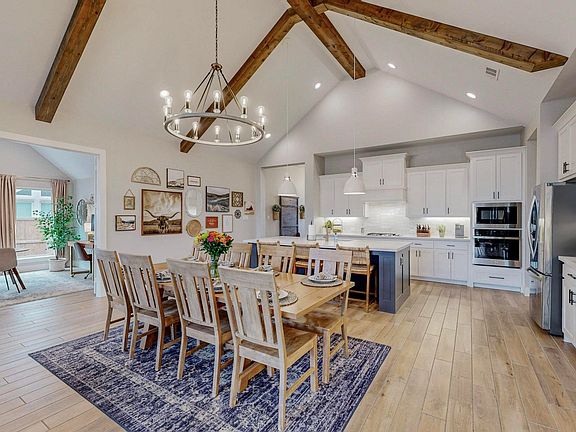 Inside, prepare to be wowed by vaulted ceilings with exposed wood beams, wide-plank flooring, and a warm, inviting living area complete with a gas fireplace and custom surround. The chef’s kitchen is a dream—boasting an expansive island, quartz countertops, white shaker cabinetry, gas cooktop, double ovens, designer lighting, and a walk-in pantry. Hosting dinner? The oversized dining area is ready for your next gathering!
