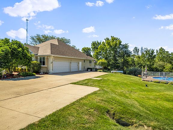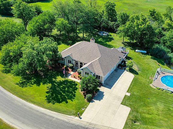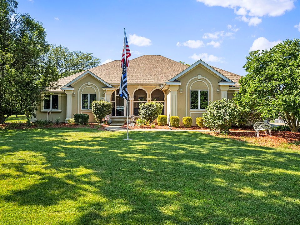 This custom-designed ranch home offers peaceful living on 2.88 acres, close to town and interstate access. Features include a pond, pool, and outbuilding. Enjoy the open living space with oak floors, expansive windows, and dramatic ceilings. The Master en suite boasts a newly remodeled bathroom, fireplace, and sliding glass doors to the deck. Additional features include a wet bar, intercom/music system, laundry room, central vacuum system, and finished 3-car garage. Updates include a radon mitigation system, A/C, furnace, and more. Relax on the multi-tiered deck overlooking the beautifully manicured yard, above-ground pool, and stocked pond. Wildlife can be viewed from the screened-in front porch. No HOA and 14-month home warranty included. The sellers are motivated to move and rave about the home's tranquility.