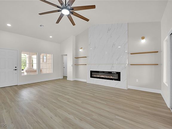Inside, you’ll find soaring ceilings, fresh flooring, and bright open living spaces. The remodeled kitchen shines with quartz counters, a stylish backsplash, and designer pendant lighting — perfect for both everyday living and entertaining. Gather around the sleek fireplace feature wall in the living room, then unwind in the primary suite complete with its own cozy fireplace and a spa-worthy bath featuring dual vanities, gold accents, and a walk-in shower.