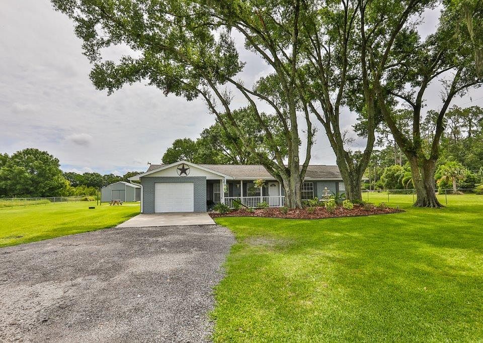 Welcome Home! This immaculate home has been completely remodeled inside! The home boasts a bright open Kitchen. Contemporary cabinets, fixtures, as well as all NEW appliances complete with Washer and Dryer! French doors off the kitchen/dining area open to the covered Lanai. Newer Electrical, Plumbing, and Drywall. New roof (2016) and New HVAC in 2016. New Whole home water filtration, softener and purification system. You will not have to worry about space to put your car, boat, RV or golf cart as there is a large additional building on the property. Plenty of room to store the big toys beside or within well appointed garage/workshop. Mature shade trees and landscaping. John Deere riding mower conveys with property. There are No HOA or CDD restrictions and plenty of room for your Family in this HIDDEN GEM! Call Now for a showing!