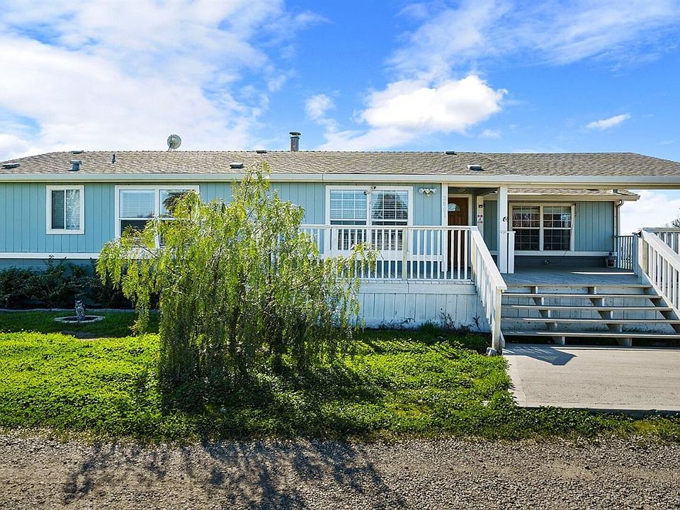 Ah, home on the range! Over 3 acres of land for you and your growing family. Built on a permanent foundation with potential horse arena & 60ft round pen. Inside you'll find a spacious layout which includes 3 bedrooms, 2 full bathrooms, and office/laundry area. Fireplace in the family room is a nice additional touch. Sloped ceilings and laminate wood flooring flow throughout the home creating an overall modern look. Space won't be an issue in this beautiful kitchen which includes double ovens & plenty of cabinet space for storage. The master bathroom is a sight to see! Elegant vanity with double sinks, spacious tub for relaxing, and a 2nd vanity in the hall. Perfect for self-care or makeup station! Outside you'll find a well-built covered deck with swimming pool which you're sure to enjoy on those hot California summers. Plus, 32 panel paid-off solar, sprinkler system, and shipping container for extra storage (40 cubic ft high). Fresh fruit from the fruit trees outside! Come see today!