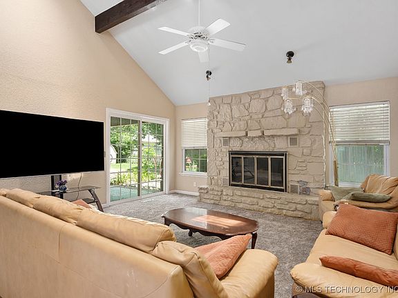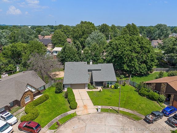 Discover this beautiful west-facing home nestled in a cul-de-sac. Recently painted inside and out, including bedrooms, bathrooms, patio, and exterior. Key features include a smart home system managing A/C, heater, locks, garage door, and security cameras. The roof is under 10 years old. The living room boasts two skylights, a vaulted ceiling with a wood beam, and a stunning stone fireplace. The primary suite, located on the 2nd level, offers a private balcony, an ensuite with a glass-enclosed shower, a clawfoot bathtub, and a skylight. Enjoy outdoor living on the covered patio overlooking the spacious, fully fenced backyard. Conveniently located off 91st and S Olive Ave: less than two miles to HWY 169 access, grocery stores, and several local parks. Less than 15 mins to several shopping and dining options in South Tulsa. Don't miss the opportunity to make this gem yours, schedule your showing today!