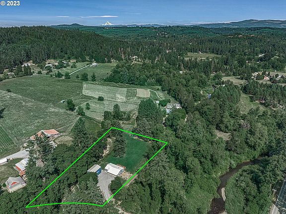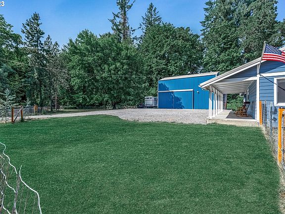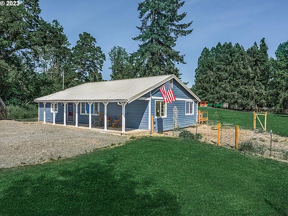 This delightful property offers a serene and peaceful retreat, situated alongside a tranquil seasonal creek. As you approach this residence, you'll be captivated by the beauty of the surrounding natural landscape. The home sits on 2 tax lots that total 1.36 acres and is fully fenced with electric wire to keep pets and livestock safe. An exciting feature of this property is the 1200 sq ft shop with 2 bays and 2nd story room. This adorable ranch home has 3 bedrooms, 2 bathrooms, and great-room style living. The Great Room features large windows that flood the space with natural light, creating a bright and airy feel throughout. The newly refreshed kitchen with wood countertops is equipped with stainless steel appliances, a farm sink, and prep island. Enjoy the easy maintenance of new vinyl plank waterproof flooring. Warm the entire home with an efficient pellet stove, installed in 2020. The primary suite features a private ensuite bathroom. A second full bathroom serves the additional bedrooms and guests. Additionally, the home includes an oversized laundry room with a new water heater and attached utility room that houses the well components. Step outside onto the backyard deck and be captivated by the stunning natural beauty that surrounds the property. The backyard is a true oasis with a tiny tranquil creek meandering through the landscape most of the year that is created by surface water from neighboring properties. At the back of the property is a darling goat barn (12 ft by 7 ft) and poultry enclosure (53 ft by 30 ft) with trees and coop, along with water and electricity. In the side-yard is a fenced garden perfect for growing your own vegetables. Enjoy the tranquility of the countryside while still being within close proximity to schools, shops, and recreational opportunities. Just a 40-minute drive into downtown Portland. Don't miss your chance to experience the beauty of nature and create lasting memories in this peaceful retreat.