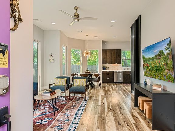 Right in the heart of East Austin this two story, three bed, two and a half bath corner lot offers no neighbors on two sides of the house. Sunny and bright, this house is down the street from Kitty Cohen, Tillery, East Austin Succulents, HEB on 7th, and the entire Webberville District. Small private backyard and driveway with garage/bar. This home includes wood floors throughout, stainless steal appliances, and washer/dryer onsite. You have access to bike lanes and trails right across the street. Along with a neighborhood bodega, this house has a 10 minute travel time to downtown and 8 minute travel time to Austin Airport.