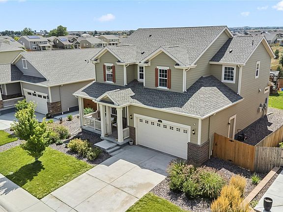 Welcome to 2802 E 161st Pl, a stunning 4-bedroom, 3.5-bath home in the highly sought-after Orchard Farms community of Thornton! This energy-efficient two-story blends comfort, style, and functionality. The landscaped front yard and charming covered porch with sitting area create a warm first impression. Just off the entry, a versatile office or flex room with double doors makes an ideal workspace. The open-concept main level offers a spacious great room with a cozy gas fireplace flowing into the gourmet kitchen. Highlights include granite countertops, a large prep island with sink and breakfast bar, stainless steel appliances, a pantry, ample cabinetry with crown molding, and a custom tile backsplash. A built-in desk nook adds convenience, while the dining area is surrounded by windows filling the space with natural light and opens to the backyard patio. Upstairs, the grand primary suite is a true retreat with plush carpeting, a tray ceiling, a generous walk-in closet, and a spa-like bath with dual vanities, soaking tub, and walk-in shower. Two bedrooms share a Jack-and-Jill bath, another enjoys its own en-suite, and the laundry room is conveniently located nearby. The unfinished basement offers abundant storage or future expansion. Step outside to enjoy Colorado living in the fenced backyard, complete with a covered patio and well maintained lawn. Solar panels add efficiency and savings, while a 3-car tandem garage provides extra parking and/or storage space. Orchard Farms residents enjoy parks, trails, playgrounds, and tennis courts, with easy access to shopping, dining, I-25, E-470, and DIA. This Orchard Farms gem combines elegance, comfort, and convenience! Don’t miss your chance to call it home!
